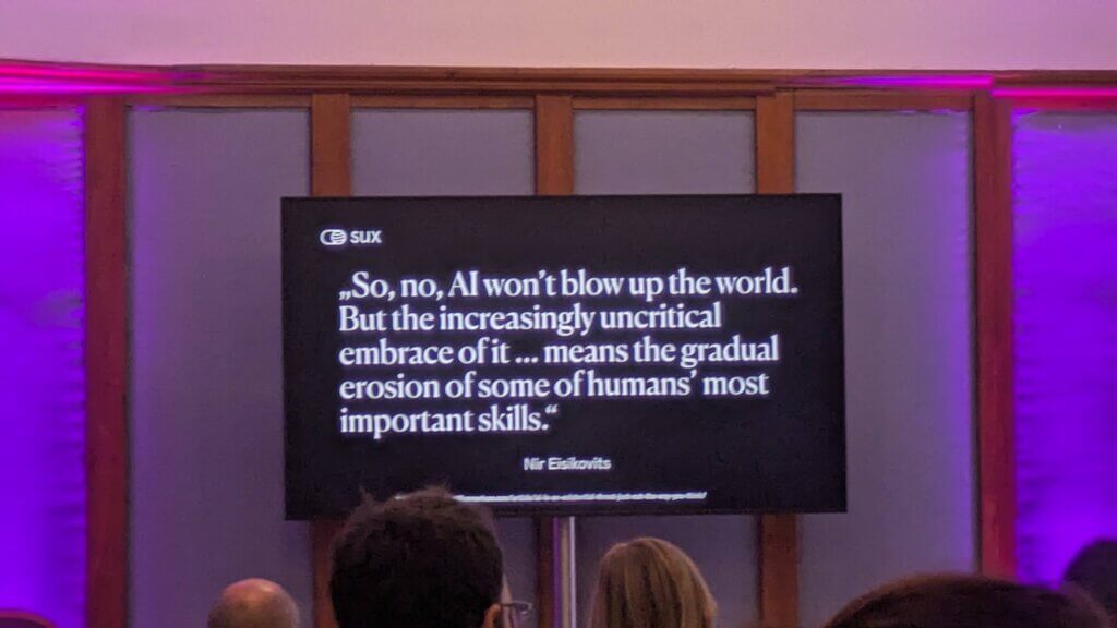 Eine Ausnahme war der Workshop von Thorsten Jonas (SUX Network): „The true Price of AI“ . Hier ging es endlich mal um die Frage, was Technologie mit Menschen macht – nicht nur mit Prozessen.
