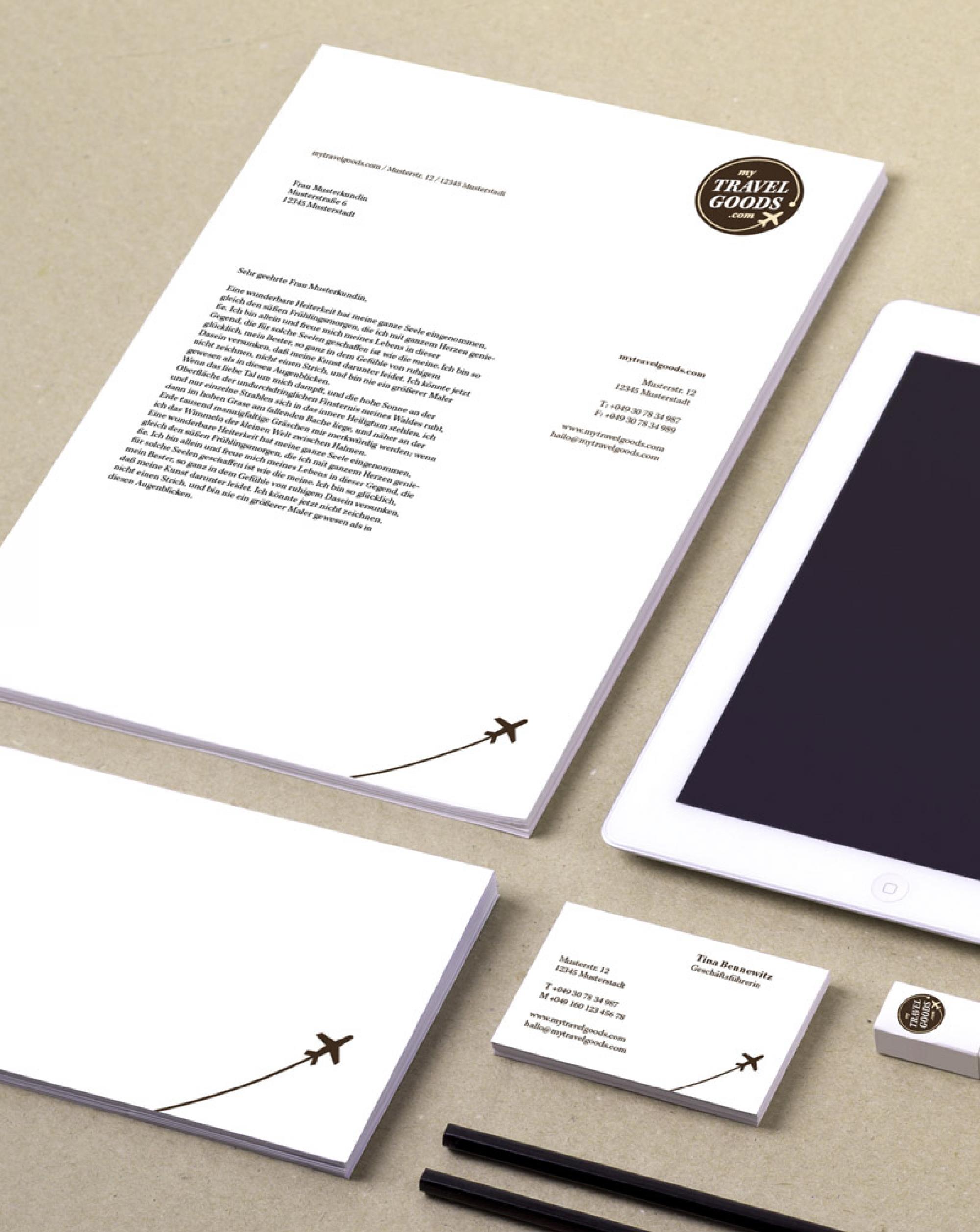 Für das Unternehmen myTravelGoods.com entwickelten wir das gesamte Corporate Design. Dazu gehört natürlich auch die Geschäftsausstattung – Briefpapier, Visitenkarten, Briefumschläge.