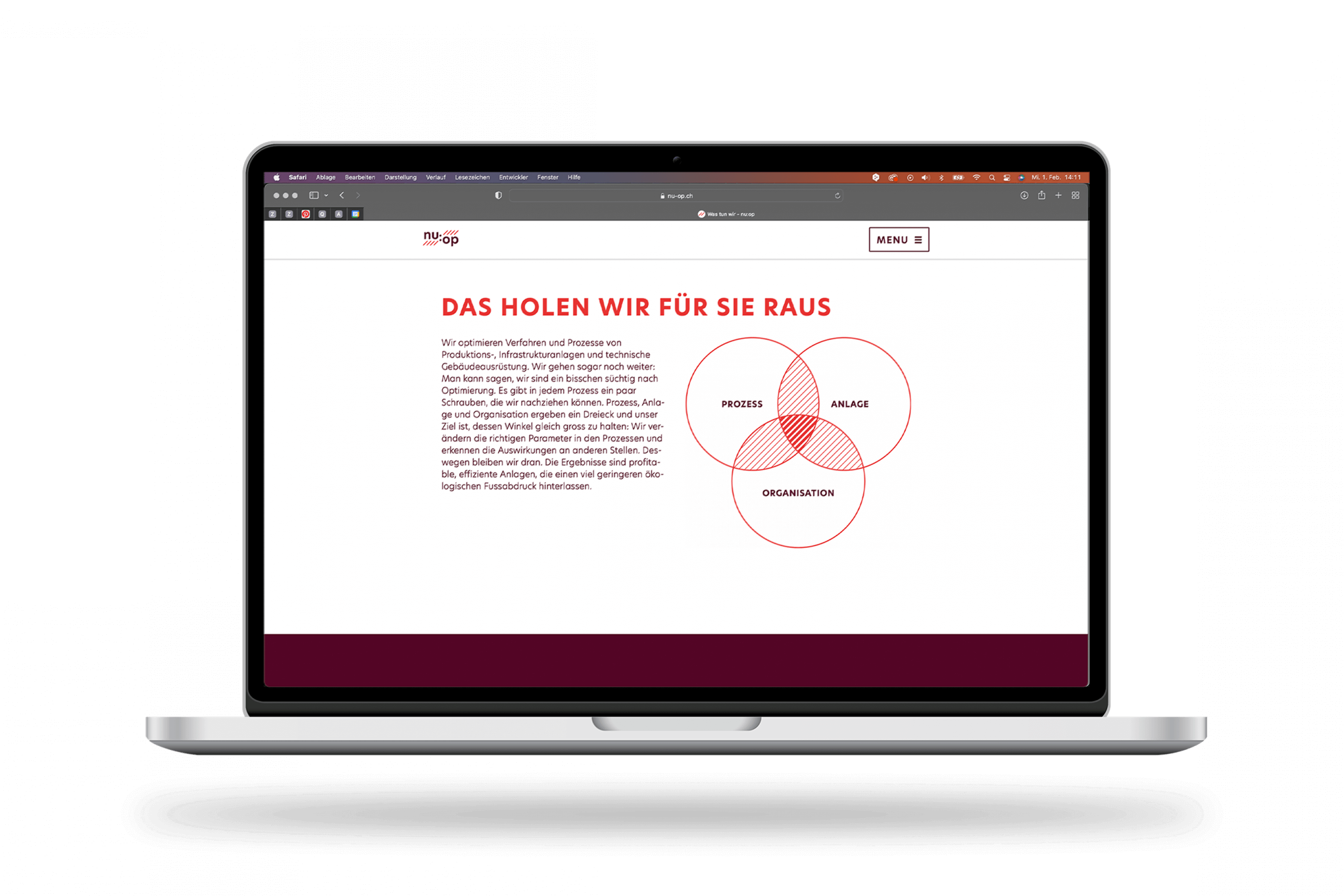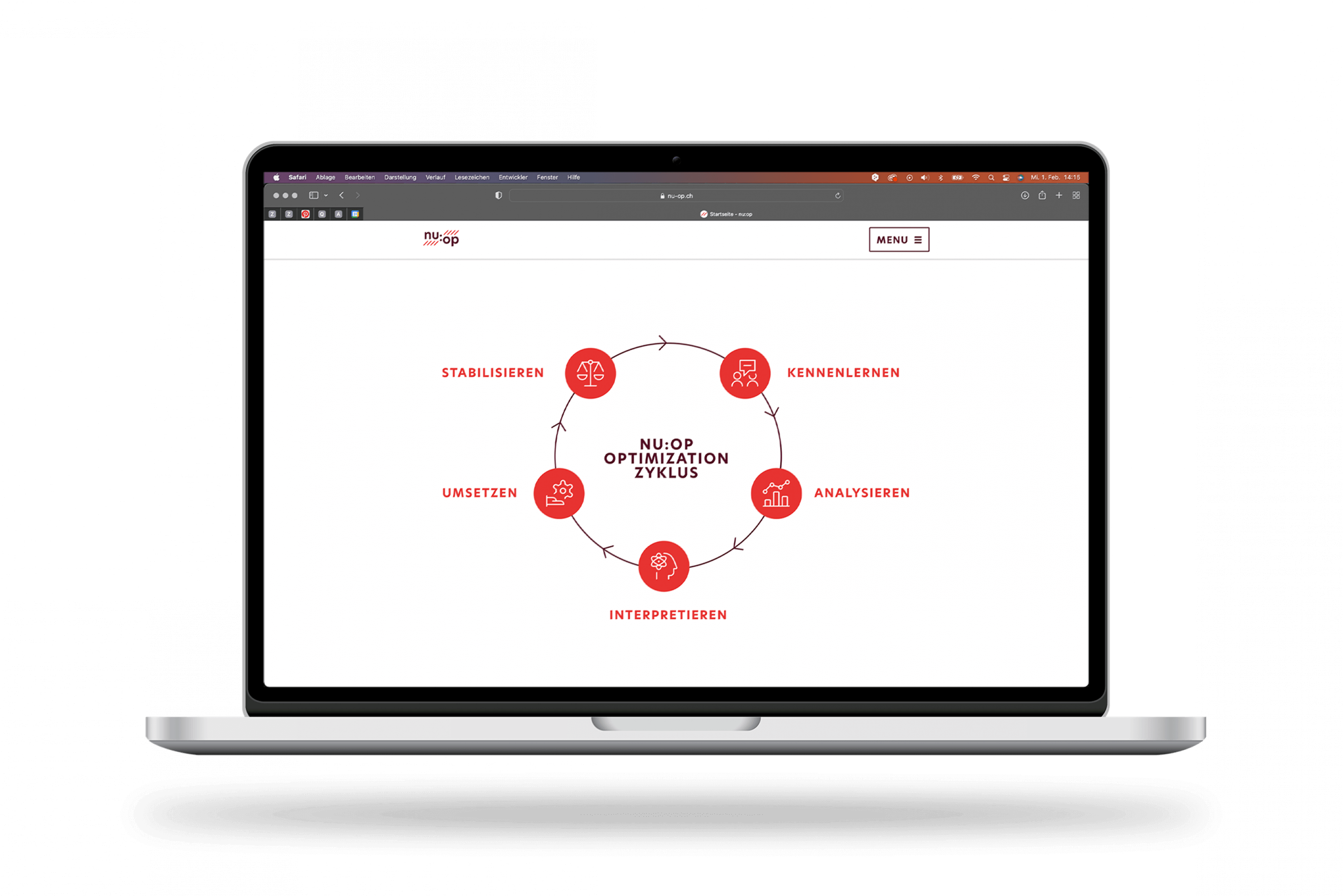 nu:op ist ein Schweizer Unternehmen, das sich hauptsächlich mit der Optimierung von Arbeitsabläufen in Produktions-, Infrastruktur- und Gebäudetechnikanlagen beschäftigt. Gemeinsam mit nu:op wurde eine Website konzipiert, gestaltet und technisch umgesetzt. Die Website soll den Nutzer:innen vor allem vermitteln, dass jeder Prozess optimierbar ist. Hier wollte nu:op mit langjähriger Erfahrung und Erfolgsbeispielen überzeugen. Was in der Kommunikation besonders wichtig war: „Wir sind anders als die anderen – keine klassischen Berater. Wir wollen auffallen.“
