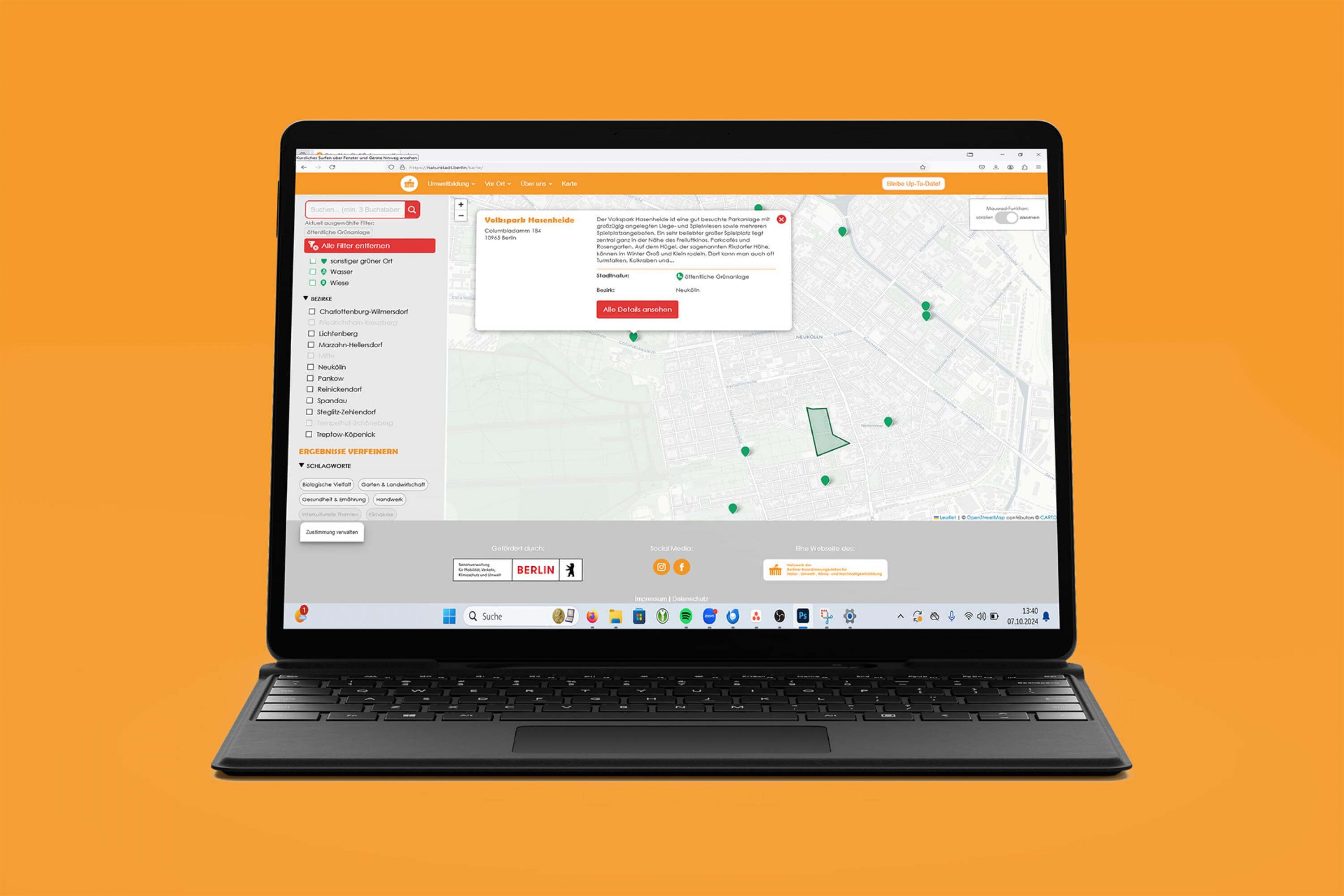 Naturstadt.Berlin kam auf uns zu um sie bei der Entwicklung der interaktiven Karte zu unterstützten. Ziel ist es, grüne (Lern-)Räume in Berlin darzustellen. Hierfür haben wir eng mit den Koordinationsstellen in Berlin zusammengearbeitet um aus den jeweiligen Bezirken die Orte auf die Karte zu bringen. Die größten Herausforderungen waren das Sammeln der Orte mit den ganzen unterschiedlichen Eigenschaften, welche für die jeweiligen Orte ausgefüllt werden können und dann natürlich die Filterung der Orte auf der Karte sowie die Darstellung.